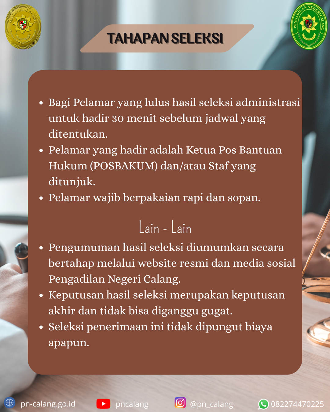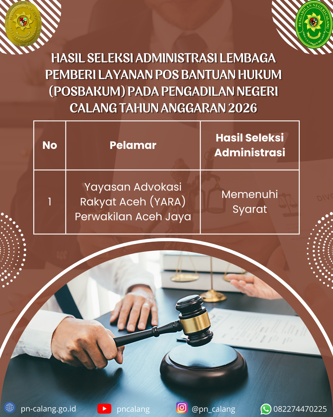 HASIL SELEKSI ADMINISTRASI LEMBAGA PEMBERI LAYANAN POS BANTUAN HUKUM (POSBAKUM) PADA PENGADILAN NEGERI CALANG TAHUN ANGGARAN 2026 Desember 22, 2025 by admpc