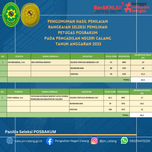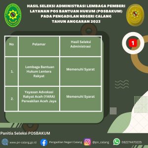 Baca SelengkapnyaPengumuman Hasil Penilaian Rangkaian Seleksi Pemilihan Petugas Posbakum pada Pengadilan Negeri Calang TA 2023